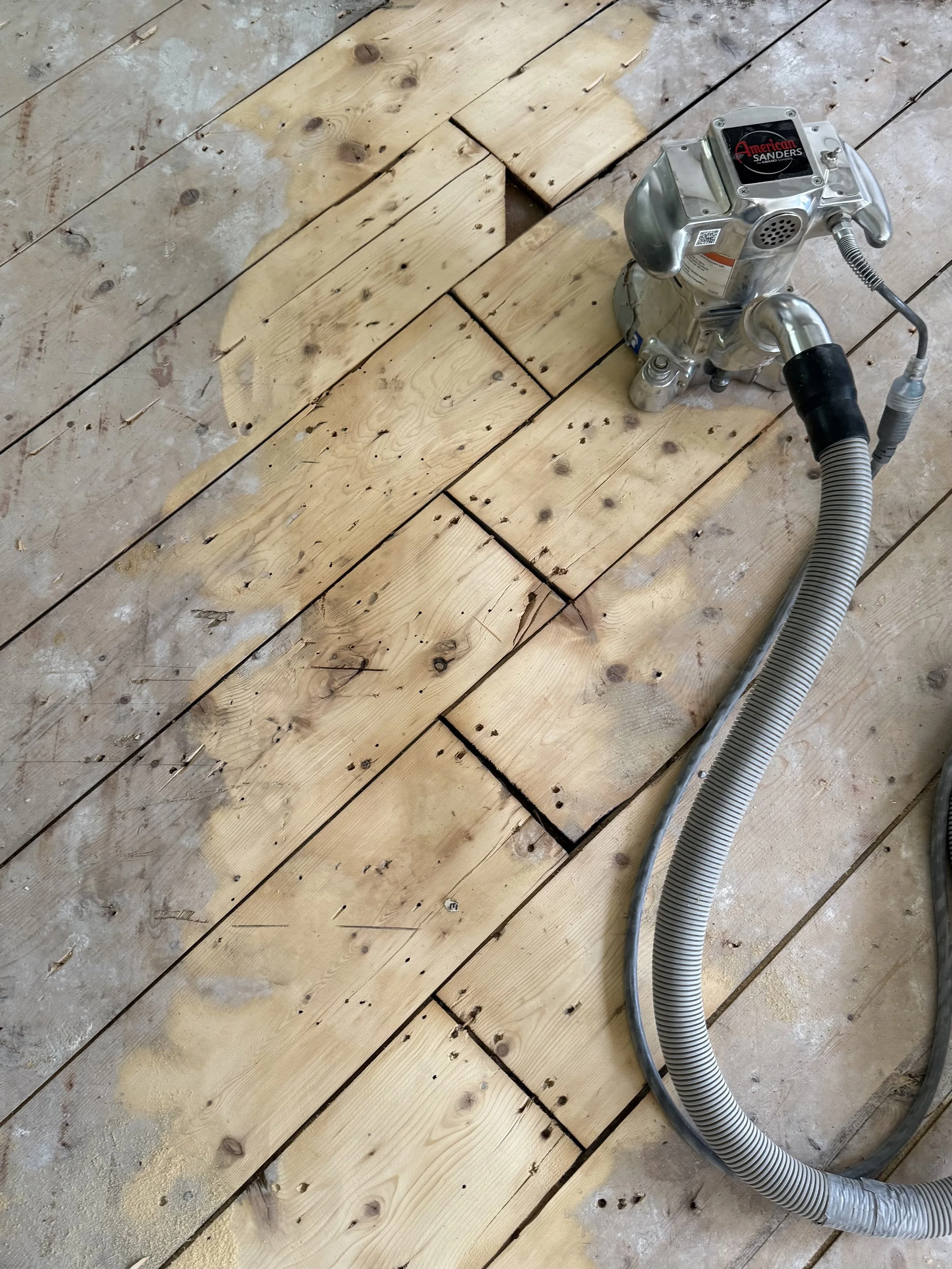 Our edgers connect to vacuums outfitted with HEPA filters and typically take care of the room’s perimeter. Here however it is being used to flatten a section of uneven subfloor prior to install. Ray’s Wood Floors has decades of experience with the best tools and practices around.
